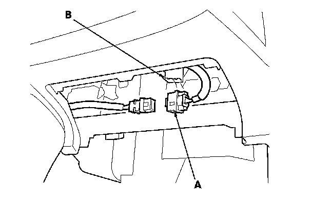 Attach the passenger's airbag connector to the connector holder (B), then reinstall the passenger's dashboard lower cover. Passengers Dashboard Lower Cover Removal/Installation