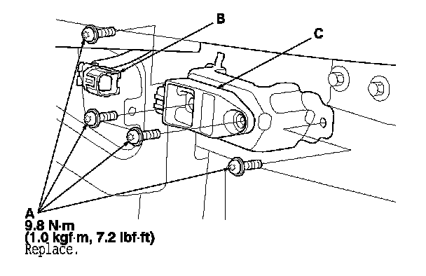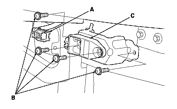 1. Install the front impact sensor with new TORX bolts (A), then connect the engine compartment wire harness 2P connector (B) to the front impact sensor (C).