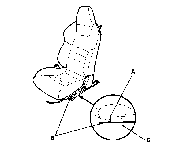 7. Using a piece of tape (A), mark a line on the seat's outer cover (B), where the front riser cover meets the seat riser (C). The driver's seat position sensor should read NEAR.