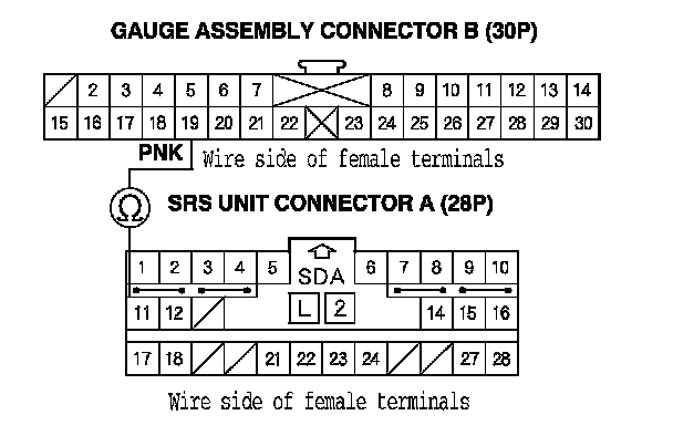 4. Measure the resistance between SRS unit connector A (28P) terminal No. 11 and gauge assembly connector B (30P) terminal No. 19. There should be less than 1.0 Ohms.