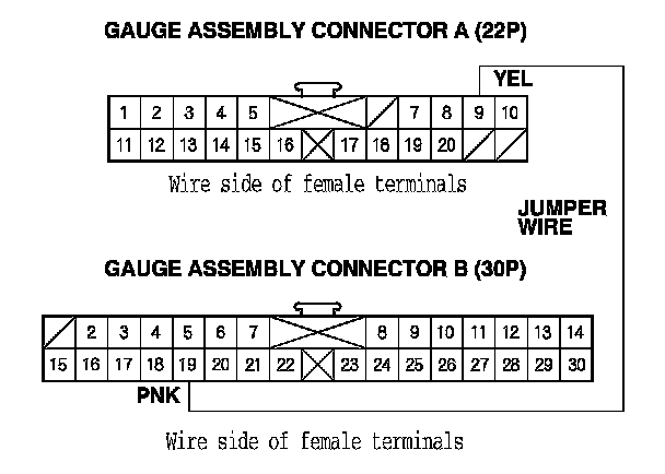8. Install a jumper wire between gauge assembly connector A (22P) terminal No. 9 and gauge assembly connector B (30P). terminal No. 19. The SRS indicator should go off.