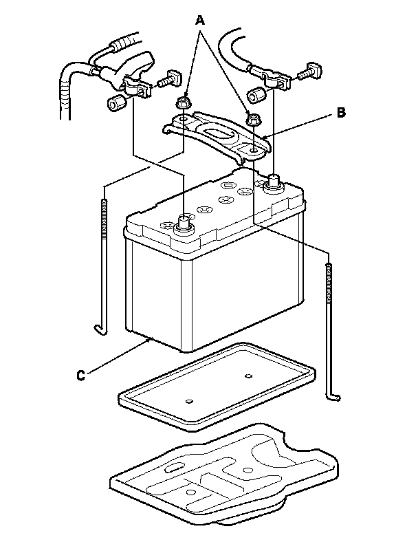 2. Remove the two nuts (A) securing the battery setting plate (B), then remove the battery setting plate and the battery (C).