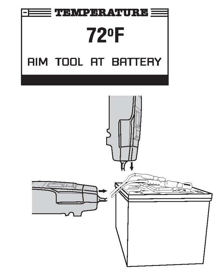 8. Measure the battery temperature by placing the analyzer's IR temperature sensor within 1 to 2 inches of the top or side of the battery. (The arrow on the top of the analyzer's housing indicates the sensor's location.) When the measured temperature on the display stabilizes, press Enter.