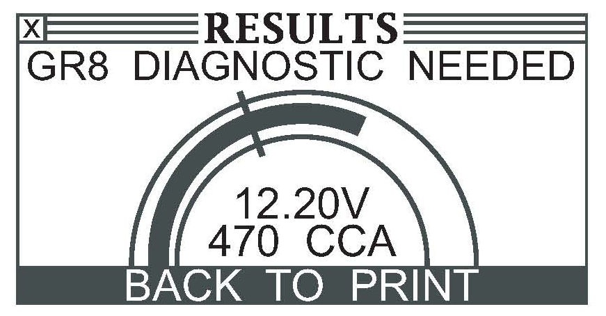 12. After the GR8 completes its diagnosis, it displays the battery's current condition. The screen shows one of three possible battery conditions, the battery's measured voltage, and the CCA. The screen includes a curved, two-section bar graph that represents the battery's condition.