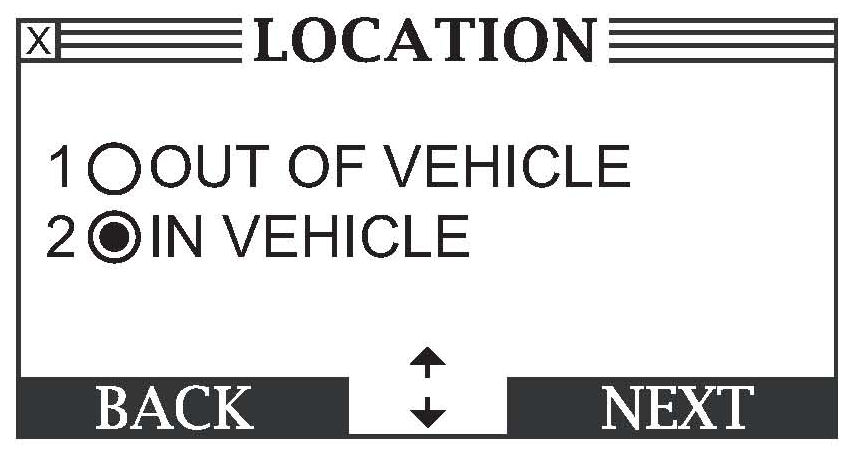 5. Use the arrow or number keys to select the location of the battery, either OUT OF VEHICLE or IN VEHICLE, then press Enter.