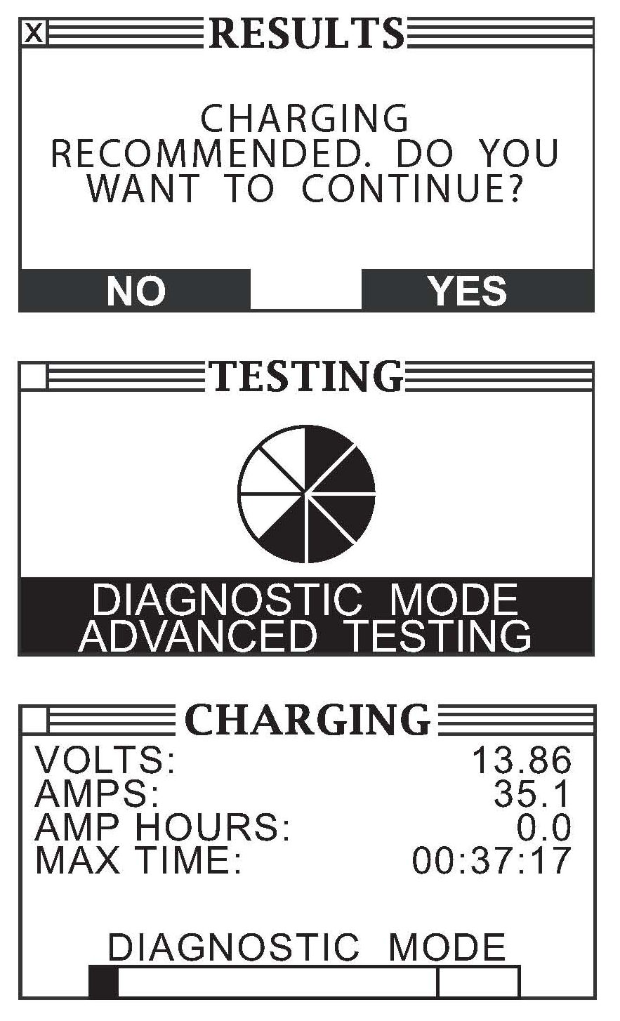 12. If the battery voltage is below 60% of its state of charge (SOC), or the condition of the battery is unknown, the GR8 automatically changes to its diagnostic feature. A screen stating CHARGING RECOMMENDED. DO YOU WANT TO CONTINUE?" appears. Select Yes. After the battery is charged and diagnosed, go to step 13.