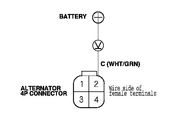 3. Measure the voltage between alternator 4P connector terminal No. 2 and the positive terminal of the battery.