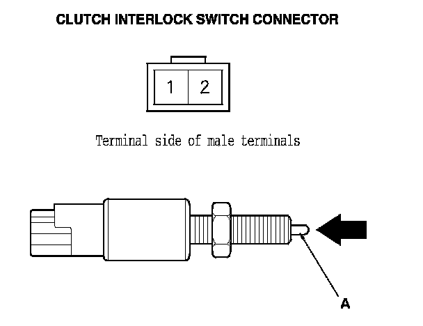 2. Check the clutch interlock switch connector terminals for continuity. There should be no continuity between the terminals with the switch (A) released, and there should be continuity with the switch pressed.