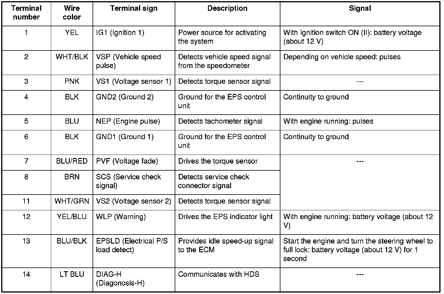 EPS Control Unit Inputs and Outputs for Connector B (14P) (Connector Disconnected)