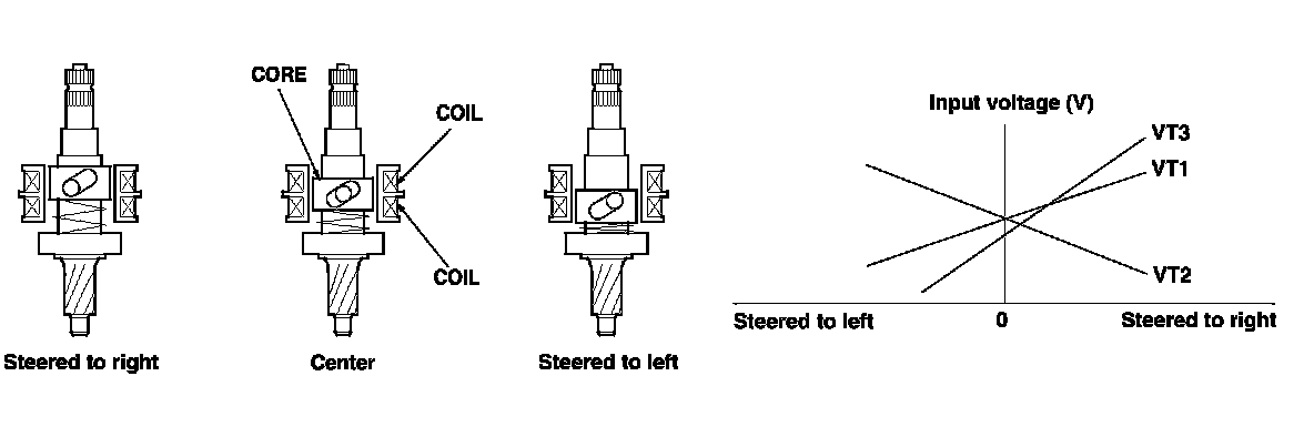 When the steering wheel is turned, twist occurs in the torsion bar between the steering side of the input shaft and the output shaft on the road reaction force side. Inductance is changed by the movement of the core. The amount this voltage changes (varies with the amount of movement, and direction of the core) is amplified with the interface circuitry of the sensor coil, and output to the EPS control unit as a steer signal.