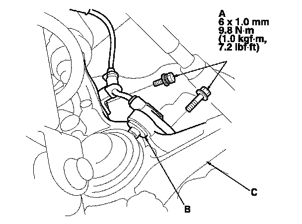 5. Remove the flange bolts (A) and wheel speed sensor (B) from the knuckle (C). Do not disconnect the wheel speed sensor connector.