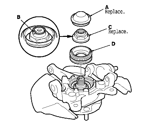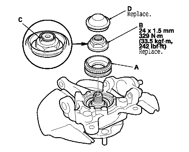 28. Apply a small amount of engine oil to the seating surface of the new spindle nut (B). Install the nut, and tighten it to the specified torque value. Stake (C) the nut shoulder against the spindle with a drift.