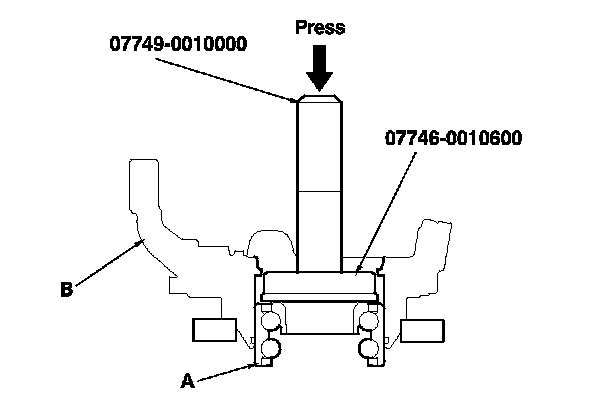 19. Press the wheel bearing (A) out of the knuckle (B) using the driver handle, the attachment, and a press.