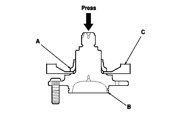 17. Separate the hub (A) from the knuckle (B) using a hydraulic press. Be careful not to damage or deform the splash guard (C). Hold onto the hub to keep it from falling when pressed clear.