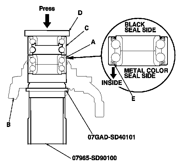 22. Press a new wheel bearing (A) into the knuckle (B) using the old bearing (C), a steel plate (D), the attachment, the support base, and a press. Place the wheel bearing on the knuckle with the pack seal side facing (E) (metal color) toward the inside. Be careful not to damage the sleeve of the pack seal.