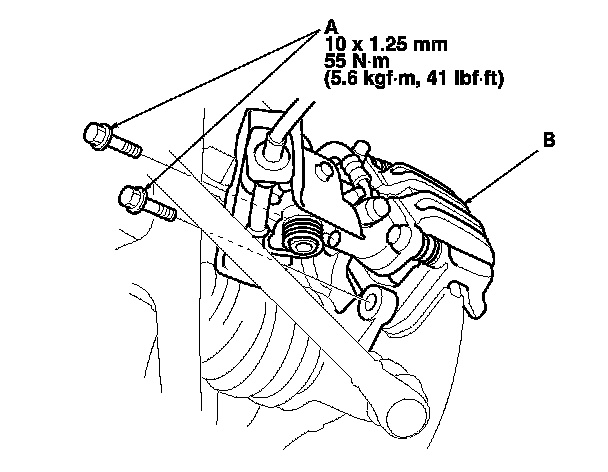 3. Remove the brake caliper bracket mounting bolts (A), then remove the caliper assembly (B) from the knuckle. To prevent damage to the caliper assembly or the brake hose, use a short piece of wire to hang the caliper assembly from the undercarriage. Do not twist the brake hose excessively.
