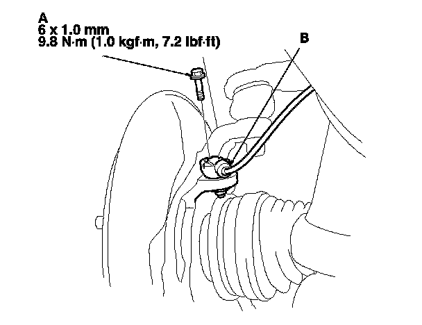 4. Remove the flange bolt (A) and wheel speed sensor (B) from the knuckle. Do not disconnect the wheel speed sensor connector.