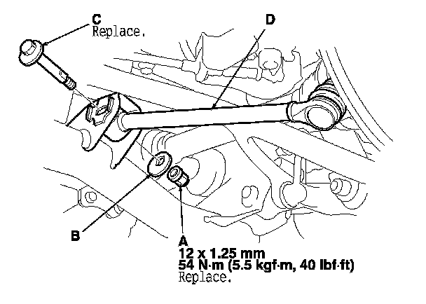 8. Remove the self-locking nut (A), adjusting cam plate (B), and adjusting bolt (C), then disconnect the control arm (D) from the frame.