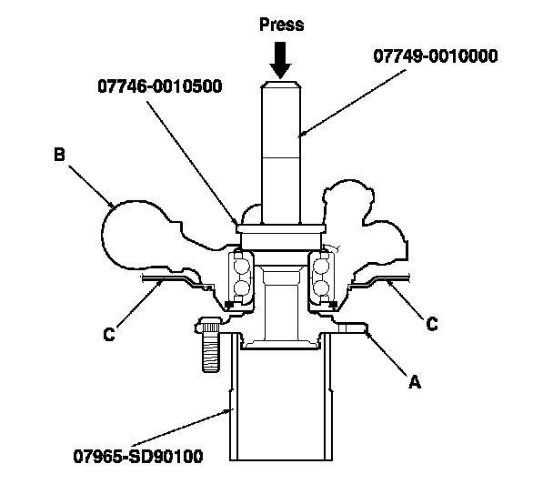 25. Install the hub (A) onto the knuckle (B) using the driver handle, the attachment, the support base, and a hydraulic press. Be careful not to damage the splash guard (C).