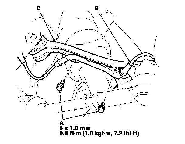 3. Remove the flange bolts (A) and the wheel speed sensor harness (B) from the upper arm (C).