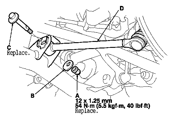 3. Remove the self-locking nut (A), adjusting cam plate (B), and adjusting bolt (C), then disconnect the control arm (D) from the frame.