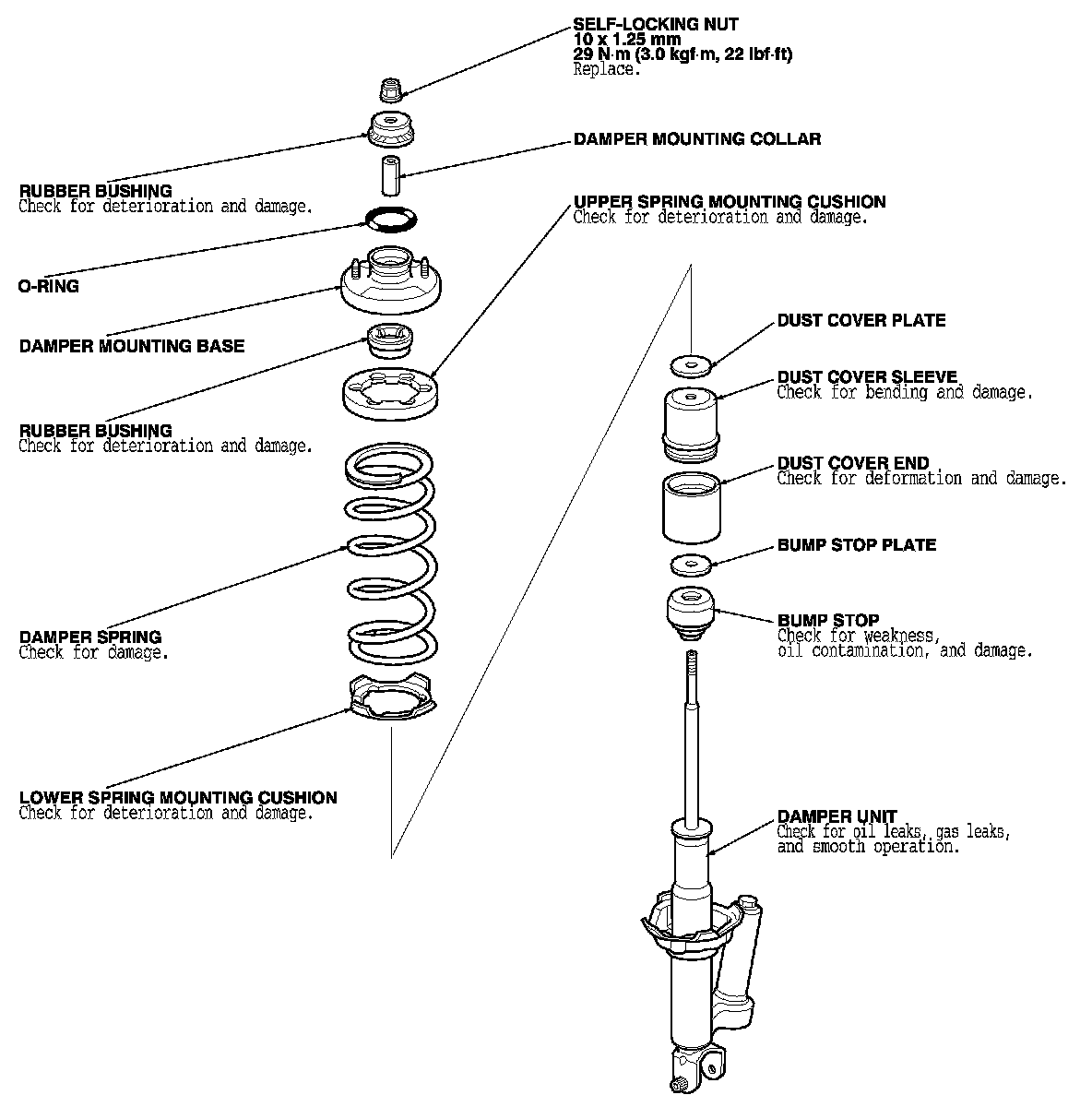 2. Release the pressure from the strut spring compressor, then disassemble the damper as shown in the Exploded View.