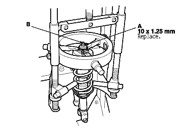 1. Compress the damper spring, then remove the self-locking nut (A) while holding the damper shaft (B) with a hex wrench. Do not compress the spring more than necessary to remove the nut.