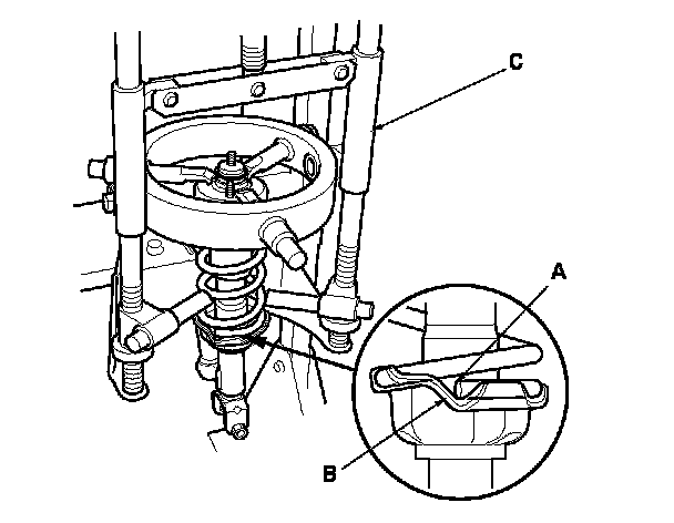 2. Install the damper/spring on a commercially available strut spring compressor (C).