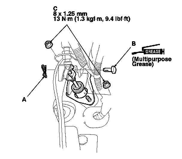 3. Pry out the lock pin (A), and pull the clevis pin (B) out of the clevis. Remove the master cylinder mounting nuts (C).
