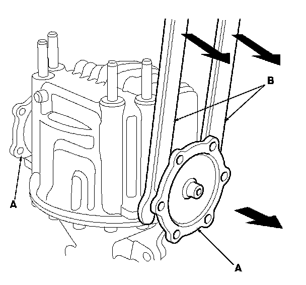 2. Remove the output shafts (A) from the differential using pry bars (B).