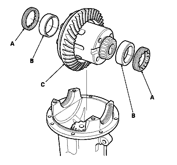 7. Remove the adjustment screws (A), the bearing outer races (B), and the Torsen LSD assembly (C).