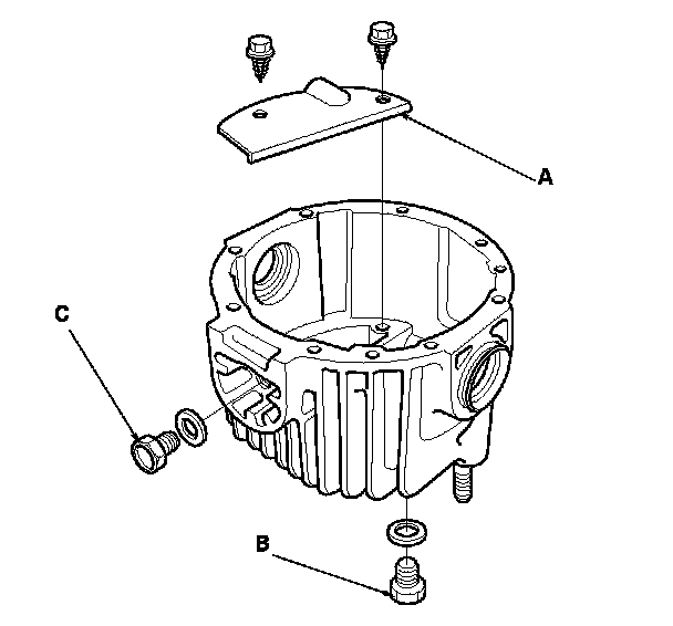 17. Remove the breather plate (A), the filler plug (B), the drain plug (C), and the sealing washers.