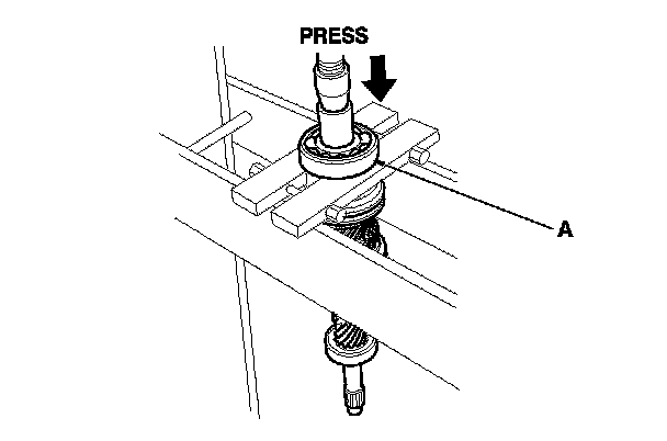 11. Support the ball bearing (A) using a commercially available bearing separator, and remove the ball bearing using a press as shown.