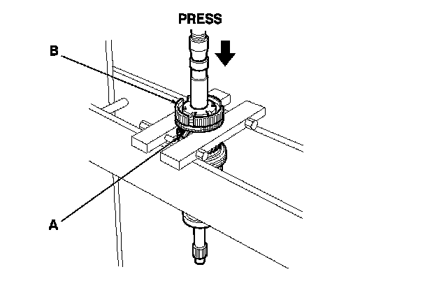 9. Support 6th gear (A) using a commercially available bearing separator, and remove the 5th/6th synchro hub/sleeve (B), the synchro ring, the synchro spring, and 6th gear using a press as shown.
