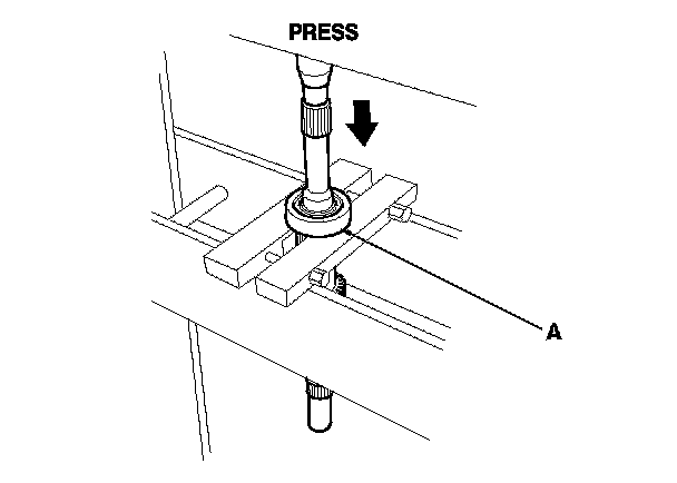 1. Support the ball bearing (A) using a commercially available bearing separator, and remove the ball bearing using a press as shown.