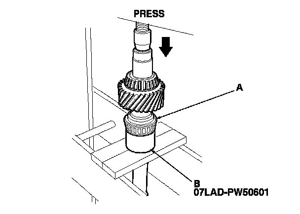 1. Press on the tapered roller bearings (A) using the 40 x 50 mm I.D. attachment (B) and a press as shown.