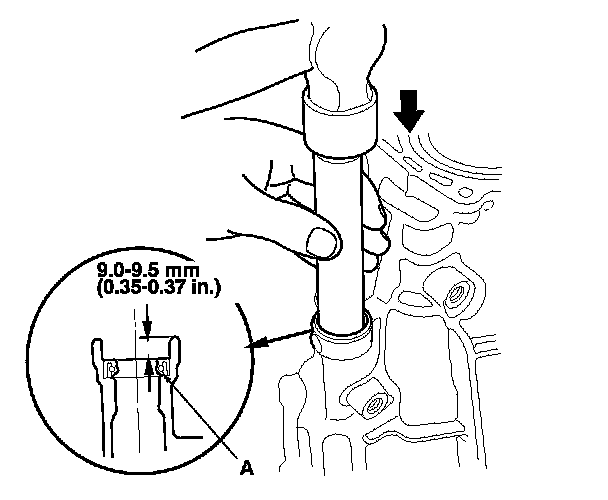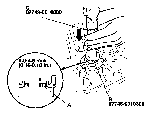 4. Install a new ball bearing (A) using the 35 mm I.D. attachment (B) and the old bearing (C).