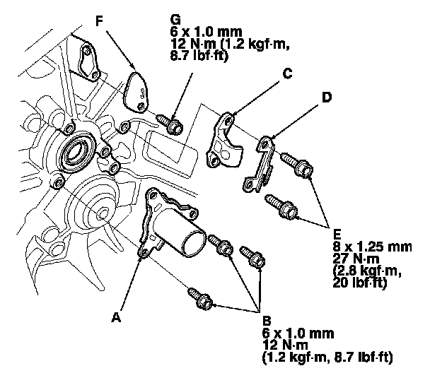 2. Install the release bearing guide (A) with three bolts (B), the clutch release hanger (C), the release hanger spring (D) with two bolts (E), and the breather plate (F) with a bolt (G).