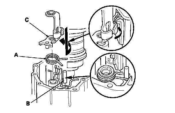 7. Install the select return spring (A) and the 8 x 40 pin (B) onto the clutch housing, then install the interlock (C).