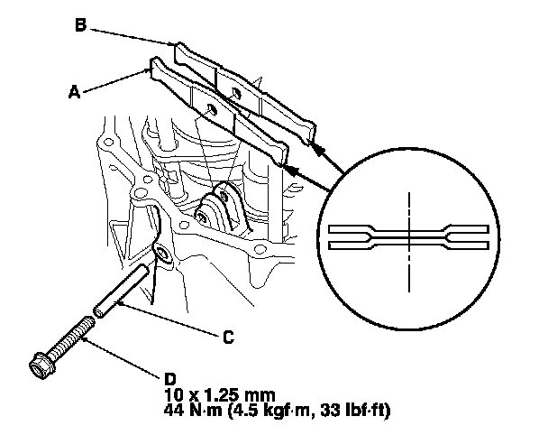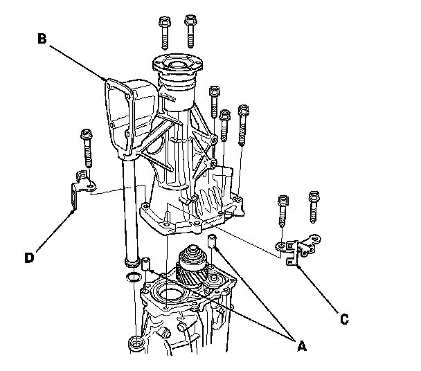 19. Install the 14 x 20 dowel pins (B), the transmission housing (C), the 8 mm flange bolts, the transmission hanger (D), and transmission hanger A.