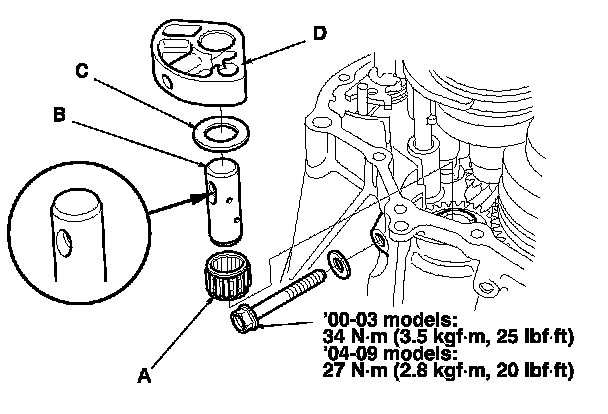 7. Install a new O-ring (A), the back-up ring (B), the spring washer (C), and a new 27 mm locknut (D) as shown.