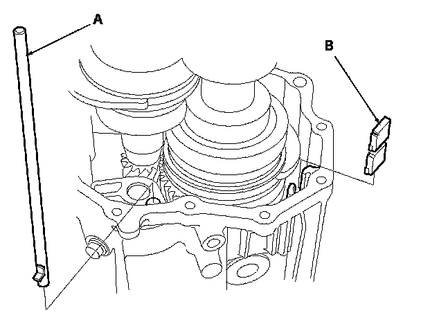 31. Install the oil pump gear (A) and oil pump gear shaft (B).