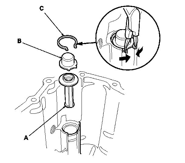 15. Install the oil pump strainer (A), the suction guide (B), and the circlip (C).
