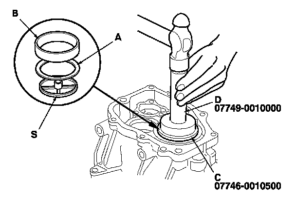 17. Install oil guide plate S and the 68 mm shim (A), then install the bearing outer race (B) using the 62 x 68 mm bearing driver attachment (C) and the 15 x 135L driver handle (D) as shown.