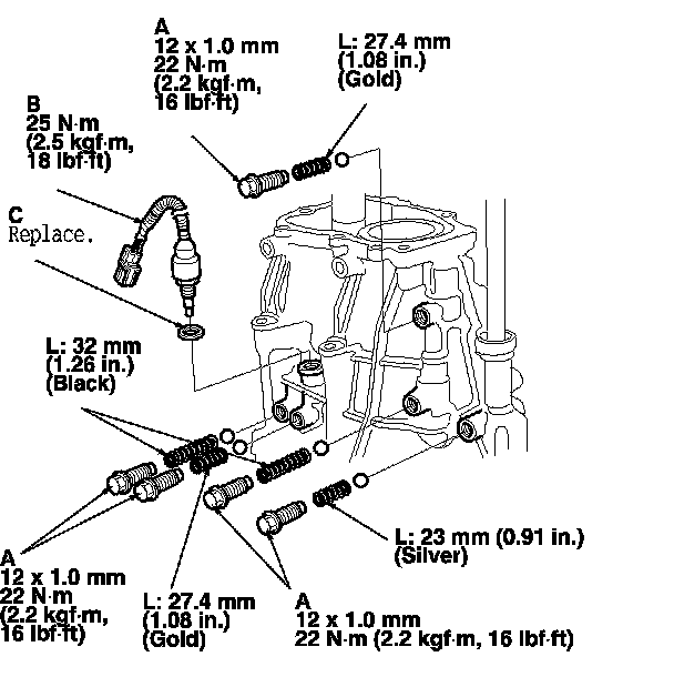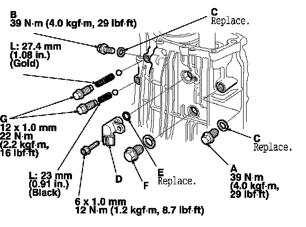 23. Install the drain plug (A) and the 12 mm drain plug (B) with new sealing washers (C), and install the vehicle speed sensor (VSS) ('00-05 models) or the output shaft (countershaft) speed sensor ('06-09 models) (D) with a new O-ring (E). Install the filler plug (F) finger-tight.