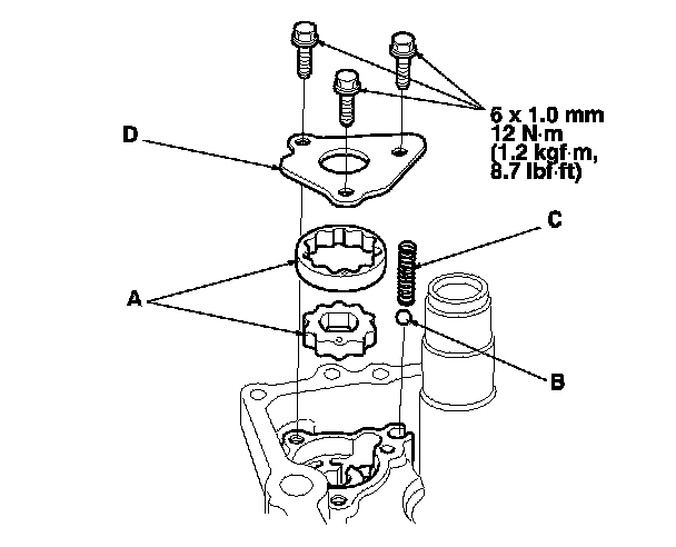 25. Install the oil pump inner and outer rotors (A), the steel ball (B), the spring (C), and the oil pump plate (D).