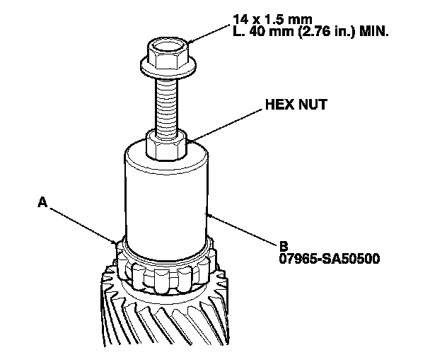 26. Install the secondary drive gear (A) on the countershaft using the 30 mm inner driver handle (B) as shown.