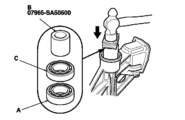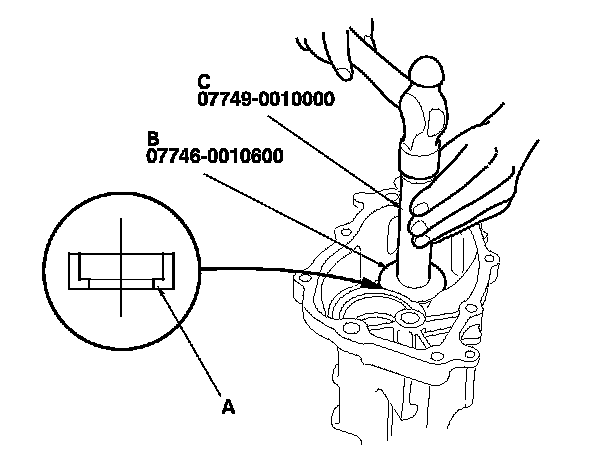 1. Install the bearing outer race (A) using the 72 x 75 mm bearing driver attachment (B) and the 15 x 135L driver handle (C) as shown.