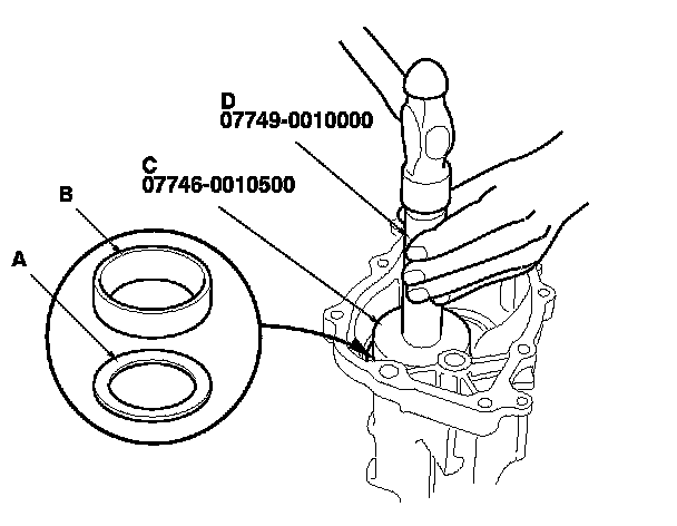 5. Install a new oil seal (A) using the 40 x 50 mm I.D. attachment (B), the 42 x 47 mm bearing driver attachment (C), and the 15 x 135L driver handle (D) as shown.