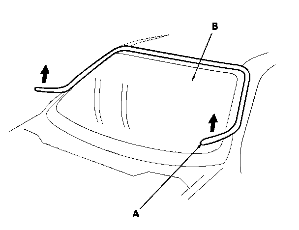 8. With a helper on the outside, pull the piano wire (A) back and forth in a sawing motion. Hold the piano wire as close to the windshield as possible to prevent damage to the body and dashboard. Carefully cut through the rubber dam and adhesive around the entire windshield.